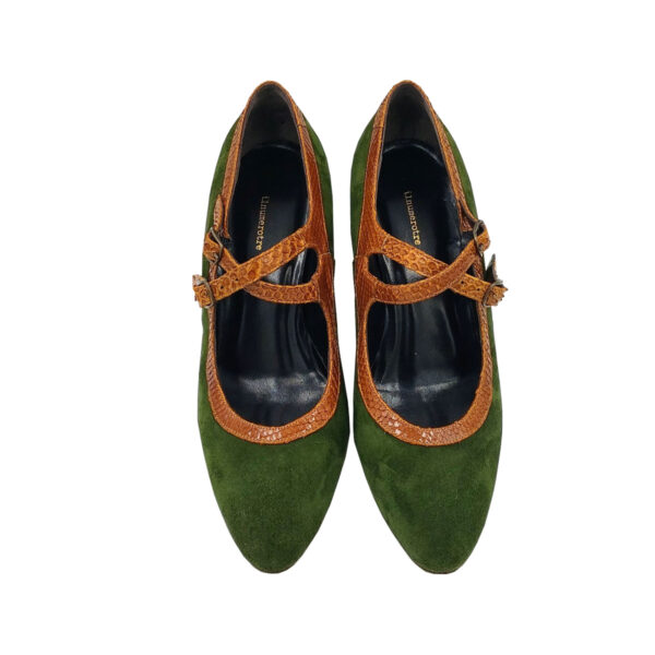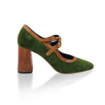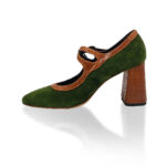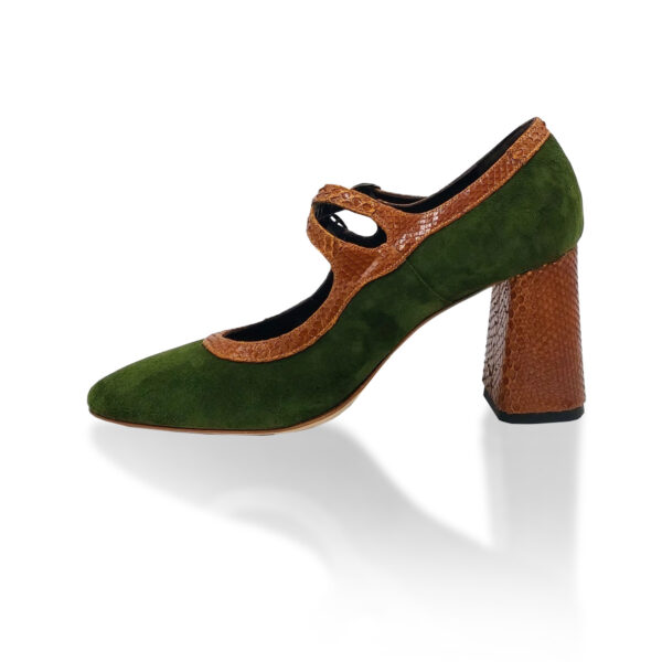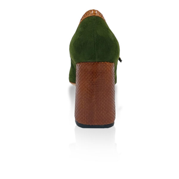 Pelle scamosciata verde sottobosco con bordature e tacco in rettile miele